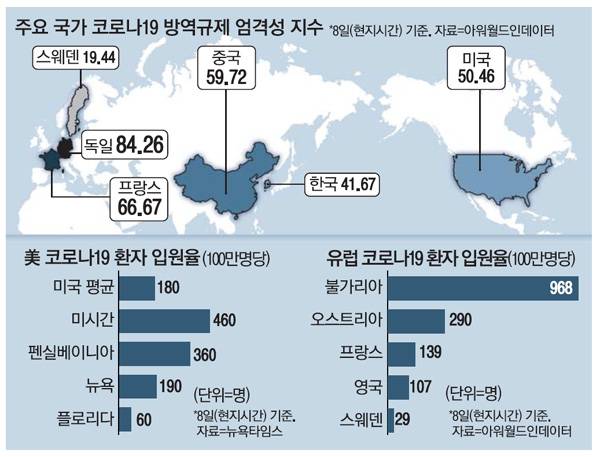 그렇다고 스웨덴의 방역조치가 강한 것도 아니다. 아워월드인데이터가 산정하는 국가 규제 엄격성 지수에서 스웨덴은 19.44로 나타났다. 학교 휴업과 직장 폐쇄, 공공 행사 취소, 공공 모임 제한, 대중교통 제한, 가정 내 거주 요구 사항, 공공 정보 캠페인, 내부 이동 제한, 해외 여행 통제 등 9가지 요소로 구성된 해당 지수는 0~100으로 수치화돼 있으며 숫자가 클수록 규제 강도가 강하다. 독일이 84.26, 프랑스와 영국이 각각 66.67, 46.76이다.