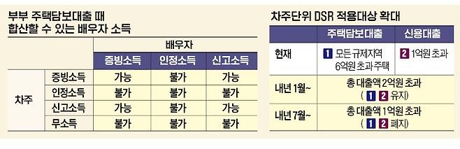 DSR은 원칙적으로 가구가 아닌, 개인 단위 규제다. DSR을 산정할 때 쓰이는 연소득과 기존 대출 원리금도 모두 대출자 개인을 기준으로 한다. 하지만 주택담보대출을 받을 때만 예외적으로 부부의 연소득을 합산해서 대출을 신청하는 게 가능하다. 소득에 비례해 대출 한도가 정해지는 DSR 규제 방식을 고려하면 부부 두 사람의 소득을 합치면 대출 한도도 늘어날 수 있다. 단 배우자가 주택담보대출을 보유하고 있지 않을 경우에만 소득 합산이 가능하다.