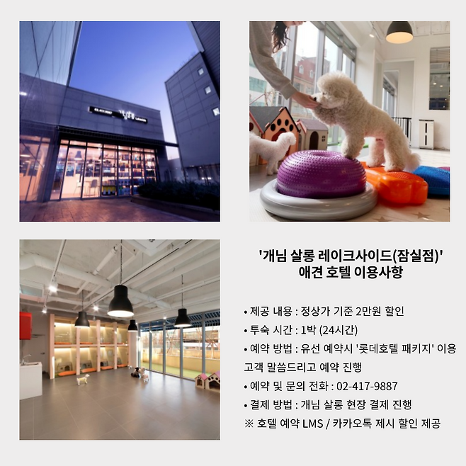 개님 살롱 레이크사이드(잠실점) 반려견 호텔 1박 2만원 할인권이 제공된답니다.