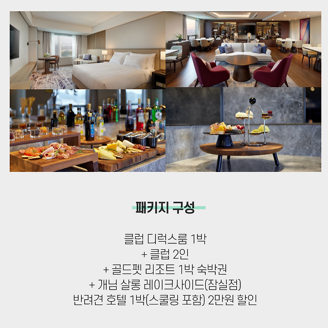패키지 구성은 반려인의 호캉스를 위해 롯데호텔 월드 디럭스 룸 1박과 클럽 2인 이용이 가능합니다.