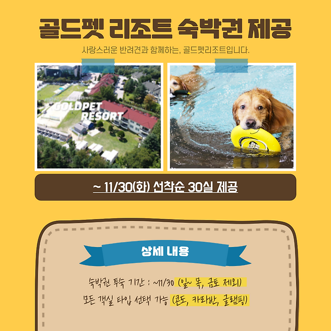 또한 반려견과 함께 숙박할 수 있는 골드펫 리조트 1박 숙박권이 제공됩니다.