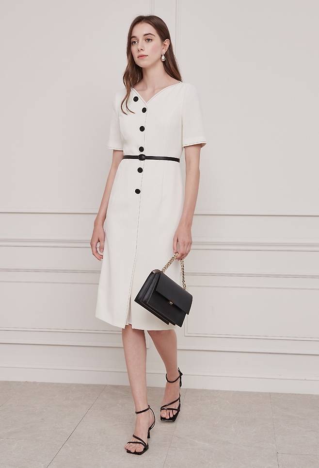 V 네크라인의 단추 디테일과 스티치 배색으로 포인트를 부여한 고급 감성의 테일러드 원피스룩으로 단아하면서 여성스러운 페미닌룩을 연출한다.