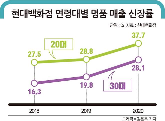 온라인에서도 마찬가지다. 하나금융경영연구소의 '세대별 온라인 소비행태 변화와 시사점' 보고서에 따르면 2020년 20대의 온라인 명품 구매 결제 금액은 전년대비 80% 증가했다. 30대는 75% 늘었다.