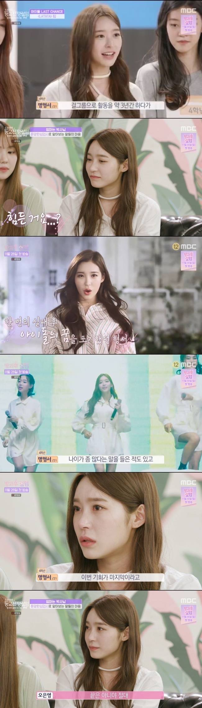21살인 명형서는 "이제는 아이돌을 못할 거라고 생각했다. 나한테는 시기가 이미 지난 건가 싶었다. 아이돌 하기엔 나이가 많다는 말을 들은 적도 있다. 연습생을 다시 시작하면 그 기간이 어떨지 아니까 상처받을까 봐 그게 두려웠다"고 털어놨다.