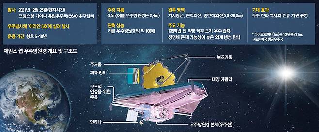 JWST의 주거울은 금으로 만든 육각형 거울 18개를 벌집처럼 이어 붙여 만든 것으로, 지름이 6.5m에 이른다. 허블 우주망원경(2.4m)의 2배가 넘는다. 관측 성능은 허블 우주망원경의 약 100배로 138억년 전 빅뱅 직후의 초기 우주까지 관측할 수 있다. 태양계 안쪽은 물론 지구에서 가장 멀리 떨어져 있는 초기 우주의 은하와 그 사이를 채운 천체들까지 우주 진화 역사의 모든 단계를 탐구할 수 있는 셈이다.