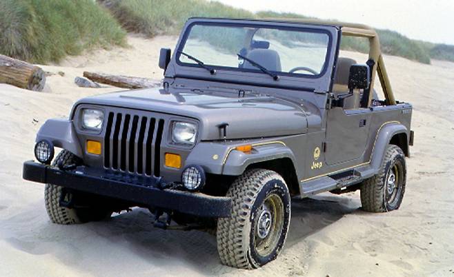 1세대 랭글러는 1987년에 탄생했어요. 2도어 컨버터블 타입의 SUV였는데 여기서 말하는 컨버터블은 우리가 일반적으로 생각하는 스포츠카에서 볼 수 있는 컨버터블과는 약간 생긴 모양이 달라요. 뚜껑을 열어서 오픈카 같은 느낌을 주는 것이 아니라, 앞 유리를 제외하고는 뻥 뚫려 있고, 뼈대만 남아 있는 것 같은 느낌에 가까운 형태의 차량이에요. 전형적인 군용차 같은 느낌의 차량인 것이죠. 이 차량의 또 다른 특징은 랭글러 시리즈들 중에서 유일하게 원형이 아닌 사각 헤드라이트를 가졌다는 것이에요. 우리나라에서는 1992년에 수입되어 판매되었는데 2.5리터 직렬 4기통, 4리터 6기통 엔진을 모두 들여와서 판매했어요.