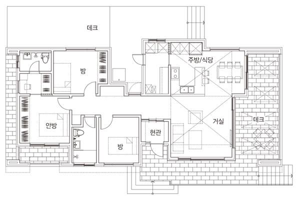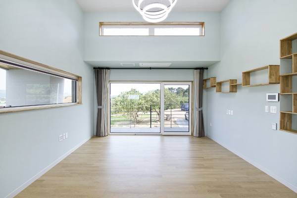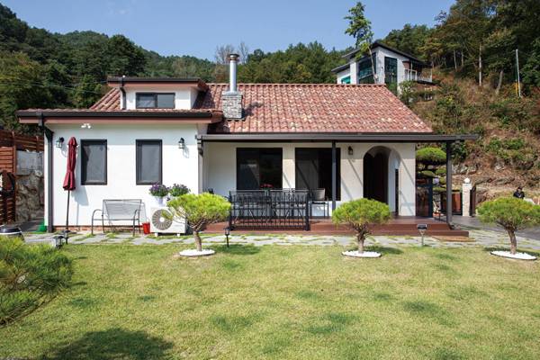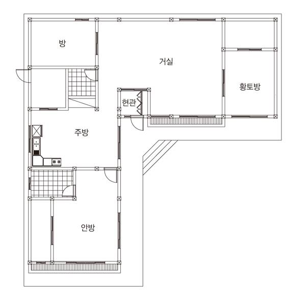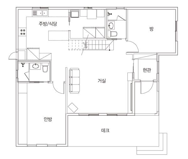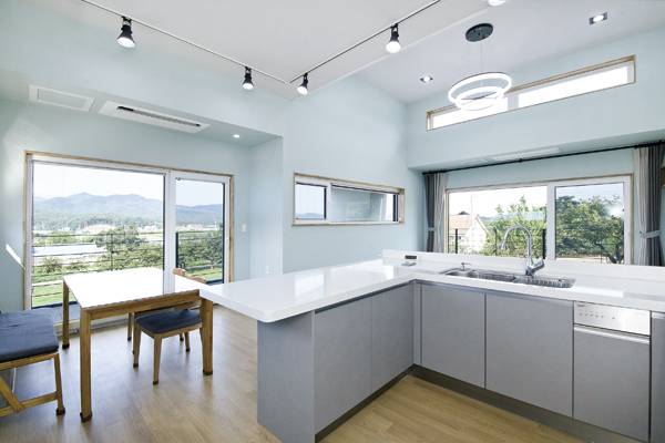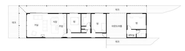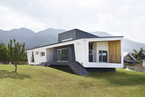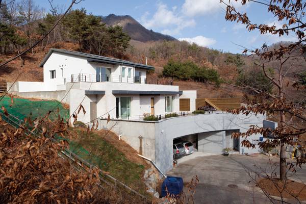 부부는 30평 규모의 단층 전원주택을 짓고 싶어했다. 침실 3개에, 두 면이 오픈된 필로티 구조의 데크를 설치해 가족이 함께 주변 경관을 즐기며 차를 마시거나 식사할 수 있는 공간을 원했다. 주택 입면은 단순한 직사각형에 군더더기 없이 심플한 모양이다. 지붕은 개방감을 주려고 천장을 높인 거실 부분에 의해 경사지붕을 형성함으로써 밋밋한 외부에 변화를 주는 요소가 됐다. 마당을 향한 오픈 데크는 대지 경사도를 6° 정도 기울여 돌출시켜 외형까지 독특하고 기하학적인 형태를 띠게 하는 장치가 됐다. 평면은 조각에서 사용하는 음각 기법으로 공간을 비워내는 방법을 사용해 심플한 형태로 만드었다. 현관을 사이에 두고 침실 3개와 거실, 주방을 구분하고 안방에 발코니와 전실, 욕실을 마련했다. 침실과 거실 사이에 데크로 나갈 수 있게 설치한 창호는 복도에 빛과 공기를 공급하는 역할을 한다. 거실과 주방은 천장고를 다르게 해 영역을 구분하고, 각각 창을 내 주변 경관을 최대한 끌어들였다. 이로써 각기 다른 기능의 창이 모여 파노라마 같은 전경을 한눈에 볼을 수 있게 완성했다.