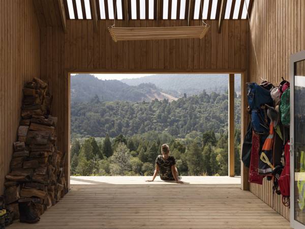 부부는 건축가에게 뉴질랜드 하이킹 대피소 ‘트램퍼 오두막Trampers huts’ 같은 미니멀 하우스를 지어 달라고 요청했다. 건축가는 요구를 모두 충족시키는 공간과 친환경 공법까지 해결하기 위해 조립식주택으로 계획했다. 건물은 지붕, 벽, 바닥을 패널 형태로 제작해 4일 만에 골조를 세우고 박공지붕을 얹어 아담한 형태를 완성했다. 외벽은 부드러운 빛을 내는 ‘툰드라 목재’를 사용했다. 툰드라 목재는 밀도가 조밀하고 뒤틀림이 적어 안정적이며, 외부에 노출되면 은빛 녹청으로 변해 멋진 색감을 띠는 자재다. 이렇게 간결한 형태와 재료 물성을 이용해 고즈넉한 시골 정서에 어울리는 아담한 주택을 지었다. 내부 공간은 아웃도어룸을 중심으로 남쪽에 게스트룸과 사무실을, 카랑가하케 협곡을 바라보는 북쪽에 거실-식당-주방-침실-욕실을 일렬로 배치했다. 북쪽과 동쪽 면에는 데크를 길게 둘러 모든 침실에서 야외로 자유롭게 오가도록 했다. 아웃도어룸은 숲과 농장 풍경, 계절을 담아낸 매력적인 반 외부 공간이다. 여기에 미닫이 헛간 문을 설치해 날씨와 상황에 따라 여닫아 공간을 다양하게 활용하게 했다.