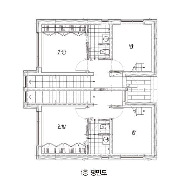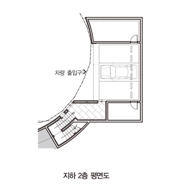 이 주택은 3층 건물처럼 보이지만, 지하 2층 구조로 된 단층 건물이다. 자연 경사를 활용해 지하 2층에 주차장을 마련하고 지하 1층과 지상 1층을 주거 공간으로 구성했다. 지하라 해도 남향을 향한 정면이 열린 구조라 실내 깊이 빛이 들어오고 환기가 수월해 늘 밝고 쾌적하다. 또, 벙커처럼 건물 삼면이 땅에 매립된 상태라 단열 성능도 좋다. 물론 경사에 의한 우수와 방수 처리는 기본이다. 실내 공간은 건축주 부부와 자녀가 독립적인 생활을 하도록 듀플렉스 형태로 구성하고 각각 별도의 현관과 공유 공간, 침실을 배치한 뒤 1층 계단 입구를 연결해 하나의 순환 동선으로 연결되는 구조로 완성했다.