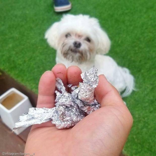 성현 씨는 단번에 바람이가 범인임을 눈치 챌 수 있었다. 첫 번째 증거는 이빨로 갈기갈기 찢어진 고구마 호일이었고, 두 번째로 하얀 털의 바람이의 입 주변에 얼룩덜룩 묻어있는 검은 흔적이 결정적인 증거가 된 것.