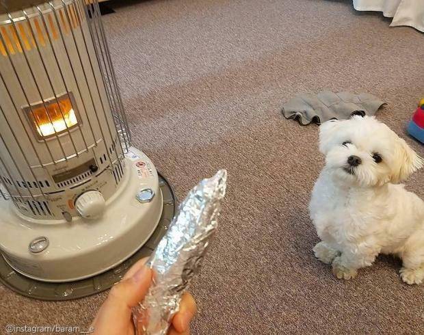 [노트펫] 보호자 몰래 새벽에 군고구마를 훔쳐 먹은 말티즈가 자신의 범죄행각(?)을 숨기지 못하고 들켜버렸다.