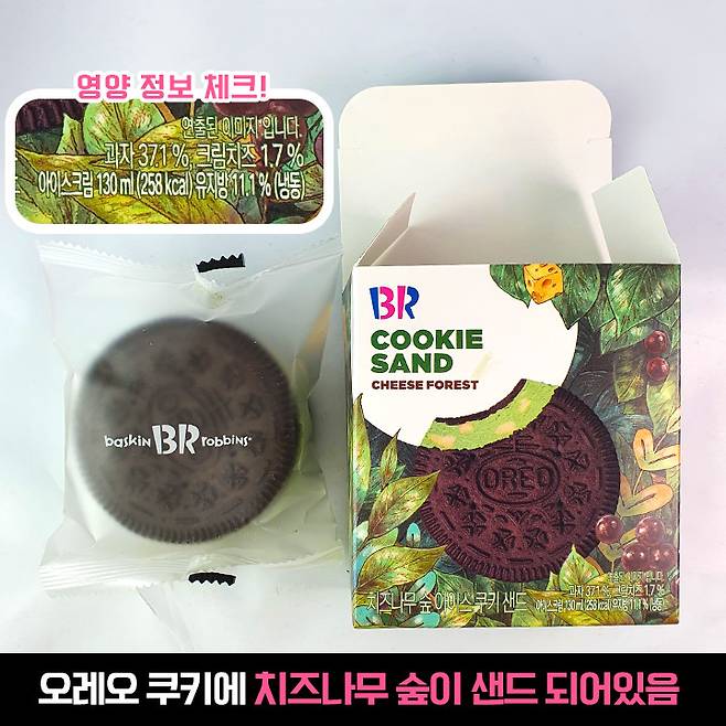다음은 치즈나무 숲 아이스 쿠키 샌드! 오레오 쿠키 사이에 치즈나무 숲 아이스크림이 껴있는 형태에요. 종이박스 안에 비닐로 한 번 더 포장되어 있어요.