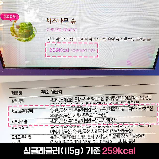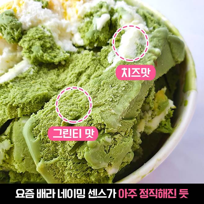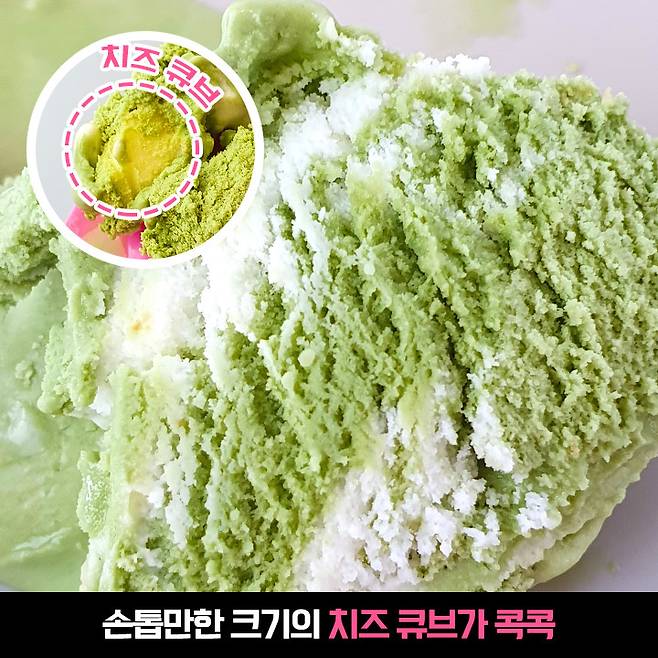 정말 이름 그대로 치즈 맛, 그린 티 맛 아이스크림이에요. 요즘 배라가 점점 정직한 이름을 많이 내네요. 엄마는 외계인, 아빠는 딸바봉 같은 배라만의 작명 느낌이 있긴 한데 말이죠ㅋㅋㅋ