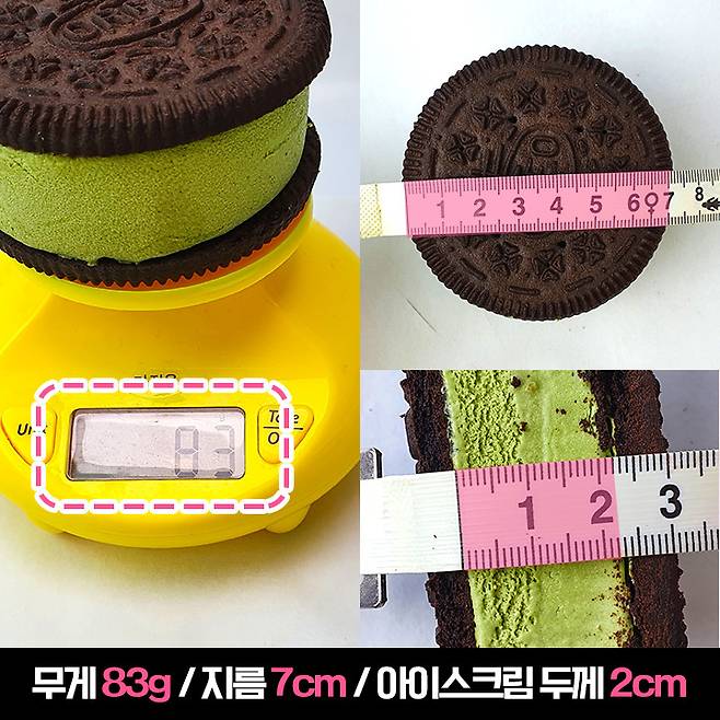 무게는 83g, 지름 7cm, 두께는 3.5cm이에요. 쿠키 제외 아이스크림 두께는 2cm였어요. 아이스크림은 녹는데, 쿠키는 단단해서 베어 물기 힘들었어요. 아이스크림이 눌리면서 결국 다 흘림ㅠㅠ