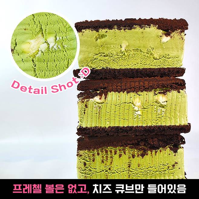 리치한 치즈 아이스크림 맛에서 쌉싸름한 말차 맛 -> 치즈 블록으로 다시 꼬수운 치즈 맛 순서로 이름이랑 딱 맞는 맛이네요. 초코볼까지 구성이 알차게 있어서 좋아요. 그런데 치즈 블록이 너무 작고, 조금 들어가 있었어요. 특히 아이스쿠키샌드ㅠㅠ 치즈 블록도 작은데, 치즈 아이스크림도 없어서 아쉬웠어요.