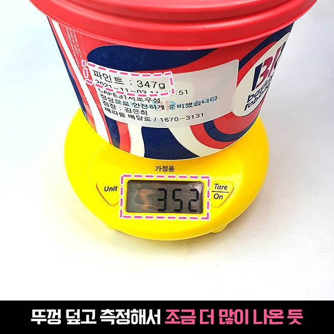 매장 측정치는 347g, 뚜껑 덮고 밥심이 측정한 건 352g이었어요. 참고로 용기 무게 제외 파인트 정량은 320g이에요. 직원분의 실수로 수령이 늦어져서 조금 더 담아주신 듯 ㅎㅎ