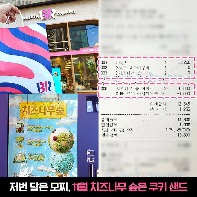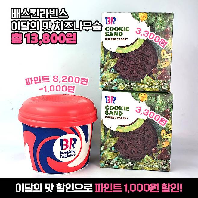 파인트 8,200원에서 이달의 맛 할인으로 7,200원에 구매했어요. 치즈나무 숲 아이스 쿠키 샌드는 하나당 3,300원이에요. 쿠키 샌드 두 개까지 합해 총 13,800원 나왔어요.
