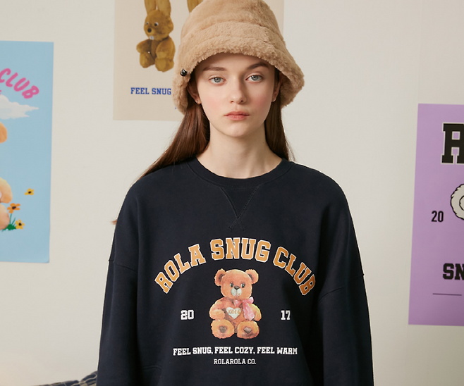 맨투맨 셔츠로 보다 소녀적인 느낌을 가미하고 싶다면 로라로라의 제품이 적당할 것이다. 이 제품은 귀여운 곰돌이 실사 포인트로 전면에 포인트를 주고, 앞판에는 포켓이 있는 디자인으로 유니크함을 더한 스웨트 셔츠다. 이 셔츠의 겉면은 면 100%로 이뤄져 있어, 입었을 때 부드럽게 몸을 감싸는 느낌이 좋은 제품이라 할 수 있다.