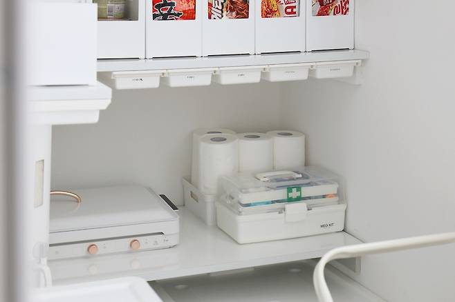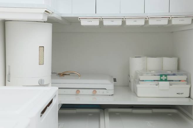 1단은 무거운 쌀통과 인덕션, 비상시 바로 사용할 수 있는 구급함을 두었어요.