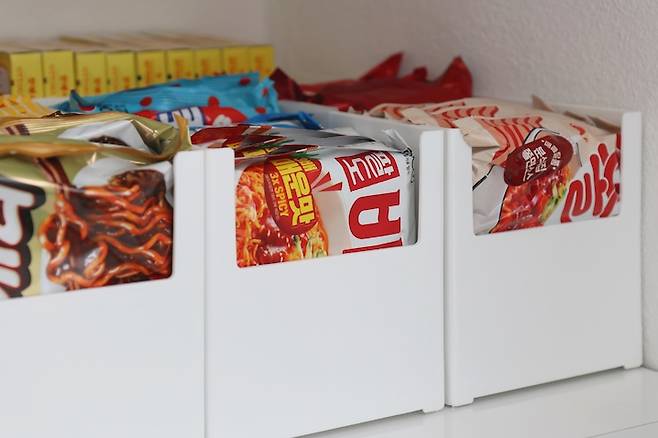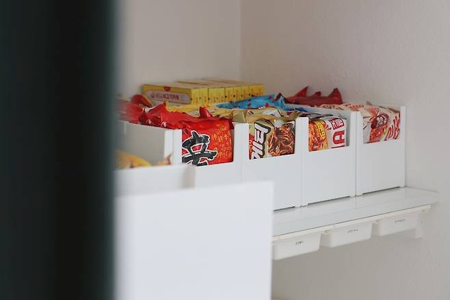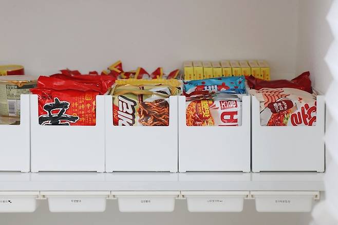 라면/통조림/면/과자 등 카테고리별로 구분해서 정리했어요.