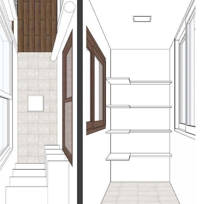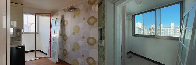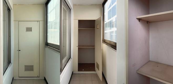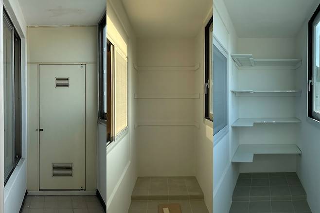 팬트리를 만들기로 결정한 앞 발코니에는 오랜 세월이 느껴지는 붙박이장이 있었어요. 굳이 필요 없는 프레임과 문 때문에 효율성이 더 떨어지는 것 같아 철거 후 선반을 짜기로 했습니다.