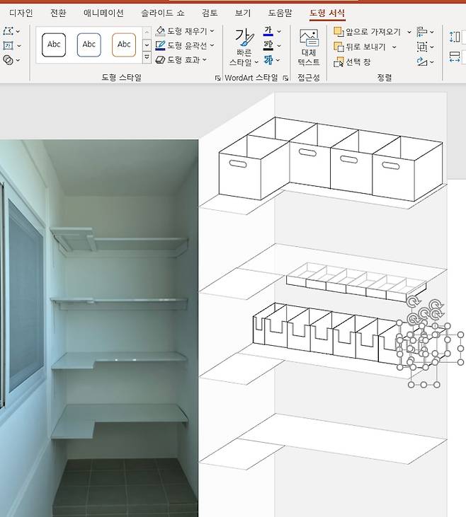 숫자만 보고도 예측할 수 있겠지만, PPT로 실제 크기에 비례하여 3D 도형을 만들고 배치해가며 크기와 수량을 파악했습니다. 확실하게 공간감을 느낄 수 있어서 이 방법도 추천드려요 :)
