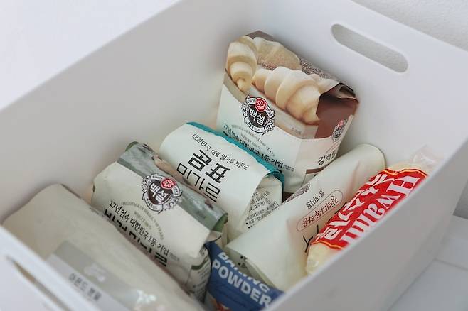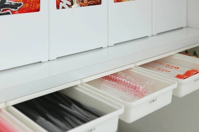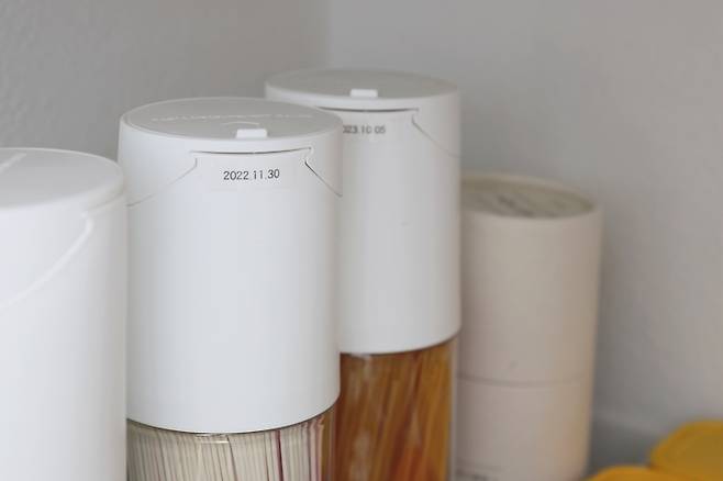 면류는 전용 용기에 담아 깔끔하게 보관하고, 유통기한도 별도로 표기해두었어요.