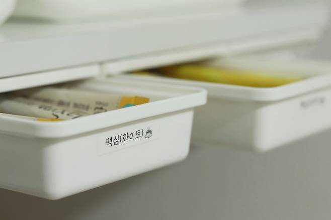 1, 2단 선반 윗부분의 남는 공간은 슬라이딩 서랍을 부착해서 수납력을 더했습니다. 내용물이 안 보이는 보관함에 라벨링은 필수-!