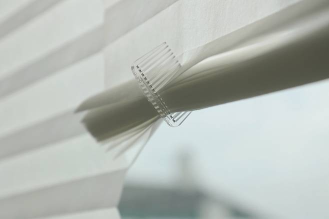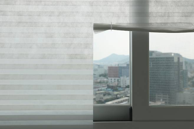 양면테이프가 붙어있어 그대로 붙이기만 하면 되고, 빛이 은은하게 투과되어서 너무 좋아요. 저녁에 사생활 보호는 덤!