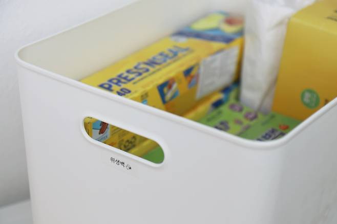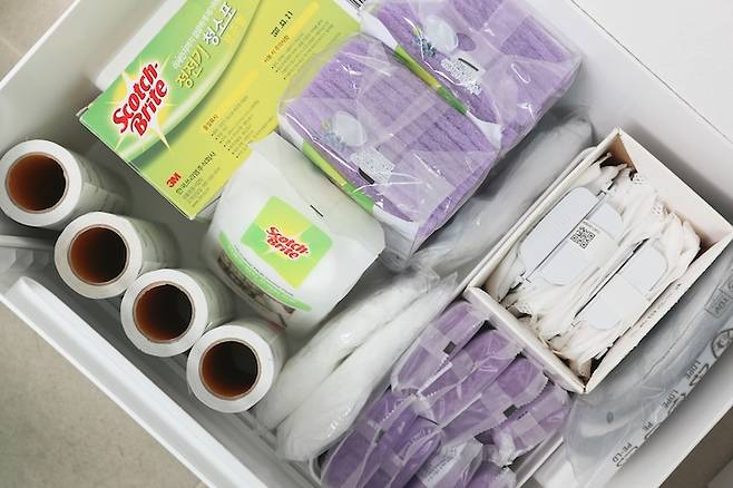 알록달록하고 크기도 제각각인 각종 위생백들. 실제 주방에서는 비닐 정리 케이스에 소분해서 사용 중이기 때문에 팬트리에 숨겨두었어요.