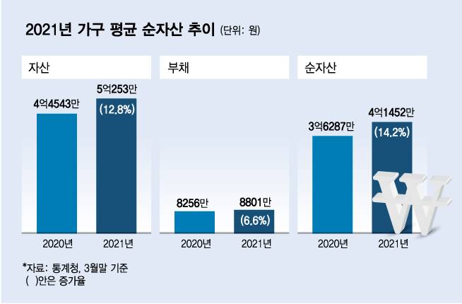 통계청이 16일 발표한 '2021년 가계금융복지조사 결과'에 따르면 올해 3월말 기준 우리나라 가구의 평균 자산은 5억253만원, 부채는 8801만원이다. 1년 전에 비해 각각 12.8%, 6.6% 증가했다. 자산에서 부채를 뺀 순자산은 4억1452만원으로 2020년에 비해 14.2% 증가했다. 2012년 가계금융복지조사 시작 이후 역대 최대폭 증가다.