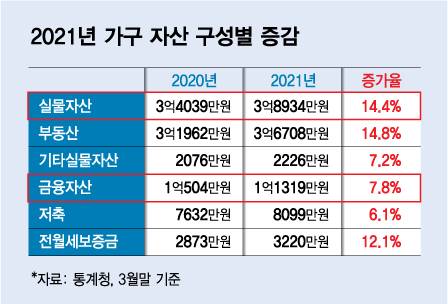 올해 우리나라 가구의 평균 순자산이 14% 이상 늘며 4억원을 돌파했다. 순자산은 부동산과 예금, 주식 등 자산에서 빚을 뺀 금액으로 부동산 등 자산 가격이 역대 최대폭으로 급등한 결과다.
