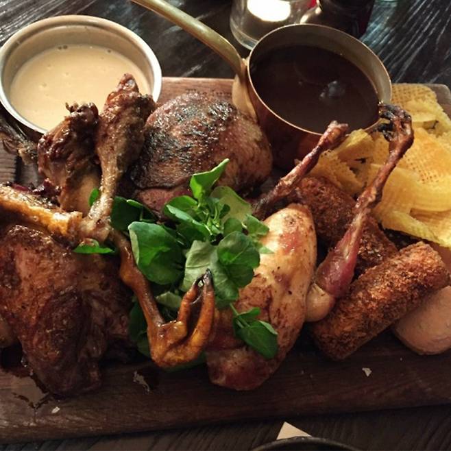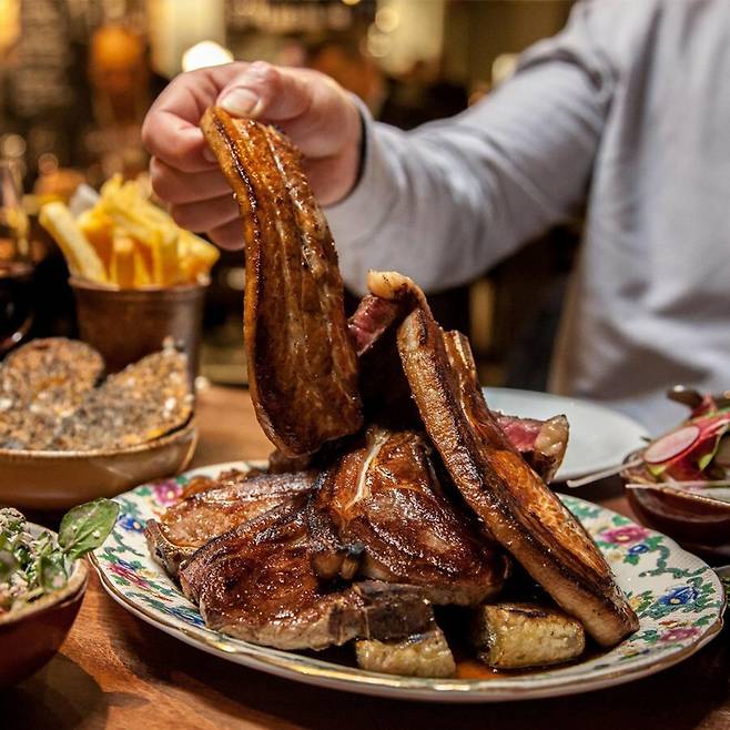 Blacklock은 거대한 선데이 로스트로 유명한 곳입니다. 예약을 잡으려면 두 달이나 걸릴 수 있다고 하니 인기를 실감하시겠죠? 이곳은 구운 소고기, 돼지고기, 양고기를 한 접시에 올리고 가니쉬 같은 곁들여 먹는 음식 또한 접시에 가득 담아내는 게 특징입니다. 고기는 숯 위에서 향을 충분히 머금도록 구워내고, 요크셔푸딩과 감자는 오리 기름을 첨가해 오븐에서 굽는다고 하네요.