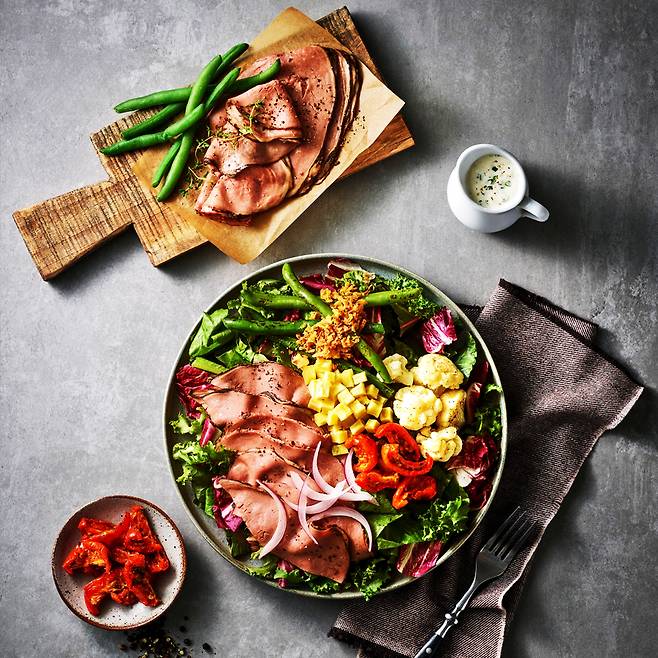 프레시코드는 선데이로스트의 본고장 런던에 못지않게 현지의 맛과 분위기를 샐러드에 그대로 재현했어요. 통째로 바삭하게 구운 홍두깨살을 로스트 해 얇게 저며 풍족하게 담았는데요. 소의 홍두깨살은 지방 함량이 거의 없으면서도 육즙이 진해 씹는 맛이 좋습니다. 또 육즙으로 만드는 그레비 소스 대신 알싸한 홀스레디쉬 드레싱 조합은 고기의 느끼함을 잡아줘요.