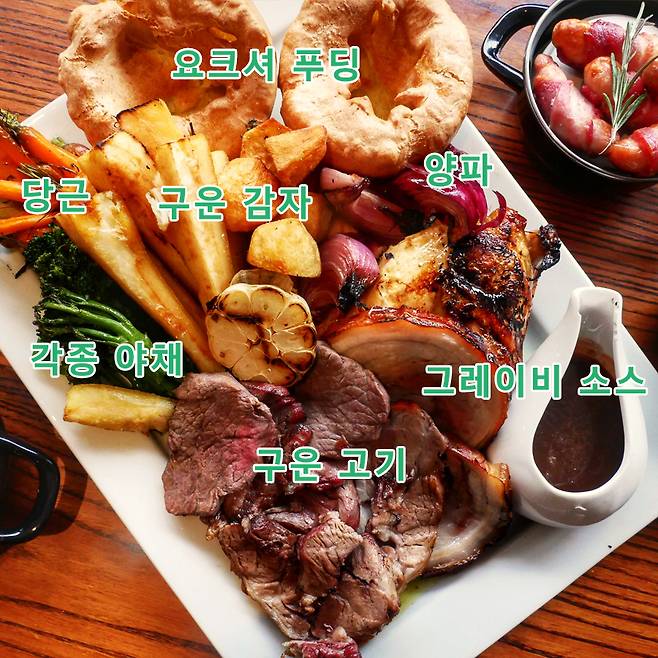 선데이 로스트에 들어가는 고기는 소고기뿐만 아니라 닭고기, 돼지고기, 양고기가 들어갈 수 있고요. 계절에 따라 칠면조나 거위 고기, 오리고기를 먹기도 해요. 채소는 굽거나 찐 것, 삶은 것을 모두 포함하는데 종류와 방식이 지역에 따라 다릅니다. 기본적으로 구운 감자가 들어가고, 주로 식사와 같이 곁들이는 담백한 요크셔푸딩, 야채로는 콩이나 당근, 브로콜리 같은 채소를 가니쉬로 곁들여요. 구운 고기는 고기 육즙으로 만든 그레이비소스에 찍어 먹습니다.