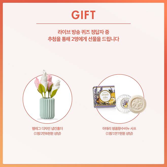 라이브 방송에 노출되는 상품은 모두 최대 12% + 당일 5% 추가 할인혜택을 진행할 예정이며, 방송 중 퀴즈 정답자를 랜덤으로 추첨하여 2명에게 특별한 리빙 아이템을 증정한다.