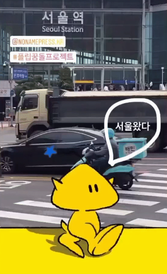 또 영웅님이 아이디어를 더해주셔서 노트의 플립북 액션을 따온 인스타그램 AR 필터를 제작하게 되었는데요. 사용자들이 필터로 사진 촬영을 할 때마다 곳곳을 걸어 다니는 꿈돌이와 함께 여행하는 느낌을 받을 수 있도록 했어요.