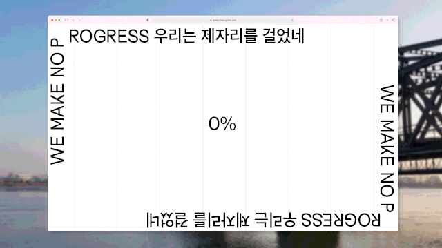 장영웅:네. 김황 작가님께서 올해 문화역서울284에서 열린 기획전 ‘보더리스 사이트 (borderless-site)’에 ‘우리는 제자리를 걸었네(we make no progress)’라는 신작을 출품하셨는데요. 노네임프레스도 좋은 기회를 얻어 작가님의 작품에 Visual Director로 참여하게 되었습니다.프로젝트는 영상, 웹사이트, 워크숍, 페이퍼, 프로그램 프로브 등이 공간에 다양한 형태로 구현될 예정이었습니다. 작업 특성상 일관된 아이덴티티 시스템이 필요했고, 작가님은 그런 부분에서 저희 팀의 작업 방식을 믿어주셨죠. 작품의 제목이 담고 있는 키워드 '제자리 걷기'와 전시 키워드 '경계'를 다양한 판형에 따라 계속 맴도는 타이포그래픽 시스템을 통해 구현했어요. 비주얼 시스템은 워크숍과 전시가 진행되는 공간, 참여자가 직접 수행하는 디자인 프로브와 웹사이트 등에도 적용되도록 했습니다 전시를 관람하거나 직접 워크숍에 참여하는 과정에서 ‘ 존재하지만 보이지 않는 경계’들을 마주할 수 있어요.