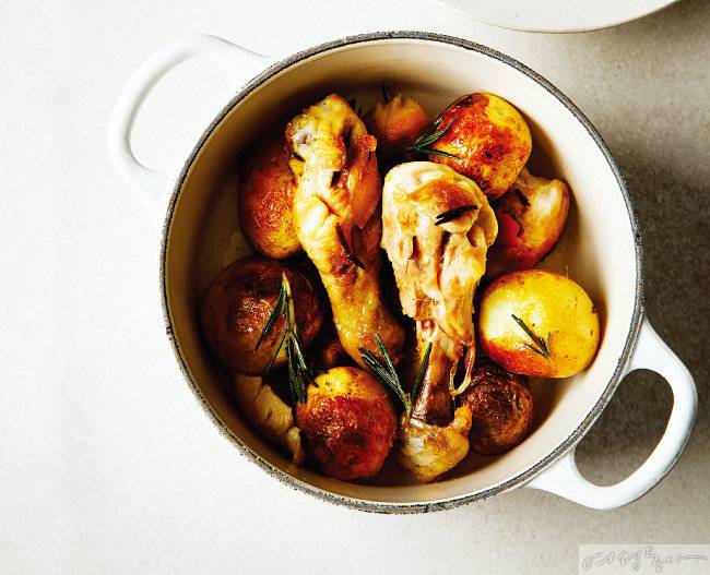 2 무쇠 냄비에 감자를 담고 사이사이에 닭다리를 넣는다. 로즈메리 잎을 두루 올린 다음 올리브오일을 붓고 후춧가루를 뿌린다.