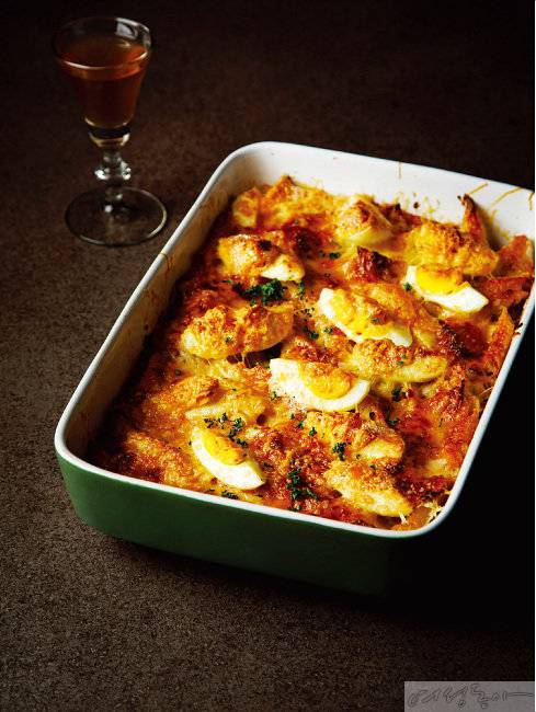 4 ②에 삶은 파스타 면을 넣고 섞어서 오븐 접시에 담고 잘라둔 삶은 달걀을 얹는다. 오븐 접시 전체를 덮을 만큼 그뤼에르 치즈를 갈아 넣고 230℃로 예열한 오븐에서 10분간 치즈가 노릇해질 정도로 굽는다.