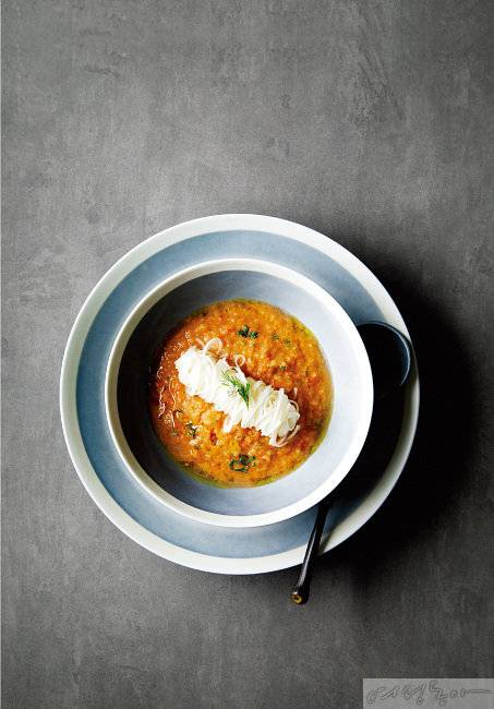 Ingredients대저 토마토 3개, 얼음물 적당량, 오이 ½개, 수박 과육(또는 참외, 멜론) 60g, 셀러리 5cm, 붉은 파프리카 ¼개, 양파 ¹/6개, 양념(다시마 물 100ml, 레몬즙 3큰술, 화이트와인 비니거 1큰술, 올리브오일 2큰술, 소금 1작은술), 소면 2~3다발, 장식(좋아하는 허브나 식용 꽃 · 올리브오일 · 얼음) 약간