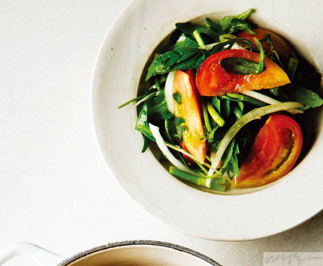 Ingredients루콜라 50g, 미나리 10줄기, 토마토 2개, 적양파 ¼개, 드레싱(화이트와인 비니거 1큰술, 올리브오일 2큰술, 소금 1작은술, 후춧가루 약간), 바질 약간