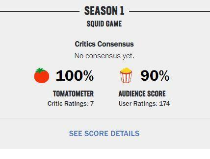 <오징어 게임>에 대한 해외 언론의 호평과 팬들의 반응도 긍정적이다. 23일 영화, 드라마 평가 사이트 로튼 토마토에서 <오징어 게임>은 평론가들에게 100% 신선도 지수를, 시청자들에게는 90% 팝콘 지수를 기록하며 상위권 성적을 기록했다.