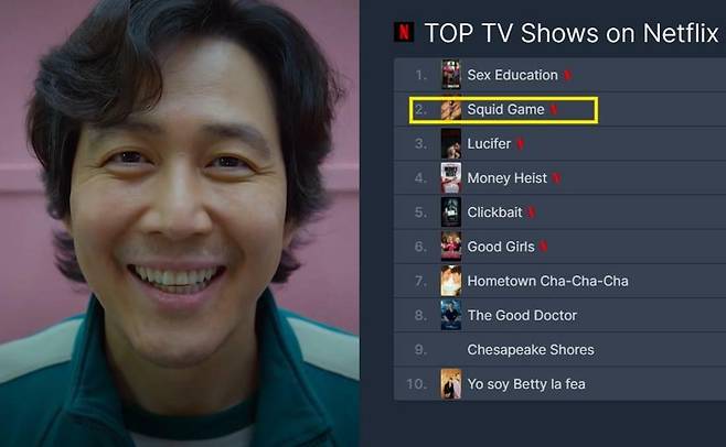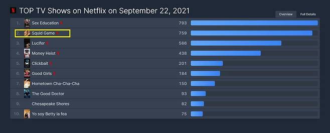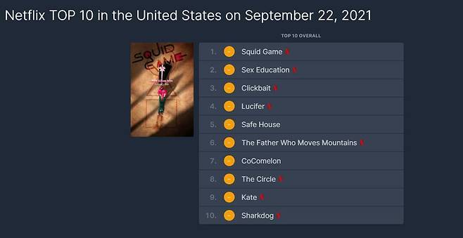 OTT 콘텐츠 순위를 집계하는 사이트 'Flixpatrol'에 따르면, <오징어 게임>은 현지 시각으로 9월 22일 글로벌 넷플릭스 인기 TV 프로그램 순위에서 <오티스의 비밀 상담소>에 이어 2위를 차지했다.