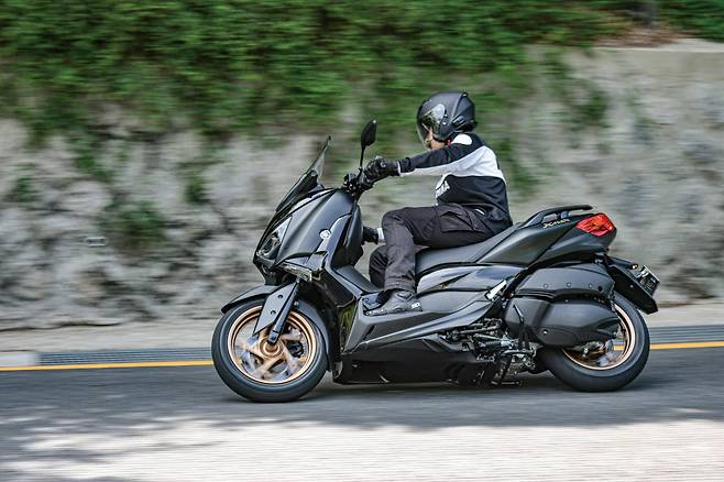 엑스맥스는 292cc SOHC 수랭 블루 코어 엔진을 탑재하여 7,250rpm에서 최고출력 28마력을 발휘하고 5,750rpm에서 최대토크 29Nm를 낸다. 도심 속에서 달리기에 충분한 출력이라 천천히 주행하거나 빠르게 가속할 때 모두 만족스럽다. 특히 저속에서 차체의 밸런스가 좋고 엔진의 반응이 뛰어나며 스티어링 각도가 커서 저속으로 좁은 길목을 빠져나갈 때 진가를 발휘한다. 반대로 풀 가속하며 내달릴 때는 순간적으로 5,500rpm까지 단숨에 회전수를 높인 뒤 6,500rpm을 거쳐 최고회전수까지 매끄럽게 가속된다. 고속영역에서도 답답함이 전혀 없다. 실제로 주행해보면 유로 5로 인한 성능 저하가 없다는 얘기를 믿게 되는 수준이다. 전후 무게 밸런스가 고르기 때문에 노면이 고르지 않은 상황에서도 안정적인 자세를 유지한다. 하지만 높은 요철에서는 충격을 제대로 걸러내지 못하기도 했다. 충격에 의해 리어 휠이 떠오르거나 미끄러지면 TCS가 곧장 개입해 수습한다.