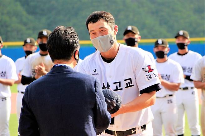 | ▲ 마산고등학교 고윤성 감독이 이번 대회 감독상을 수상받고 있다. |