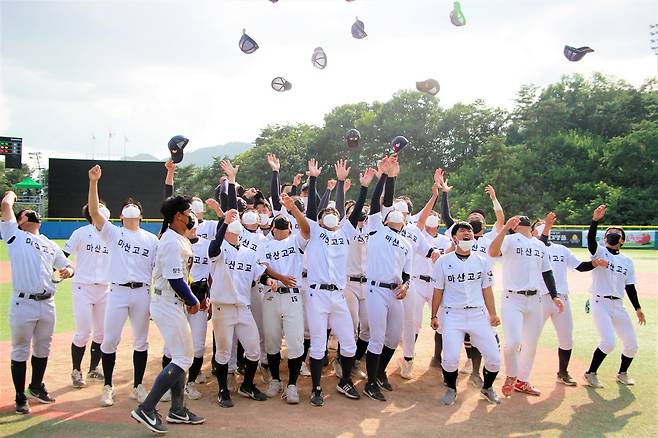 | ▲ 2021 협회장기 고교야구전국대회에서 우승한 마산고등학교 선수들이 모자를 벗어던지고 있다. |