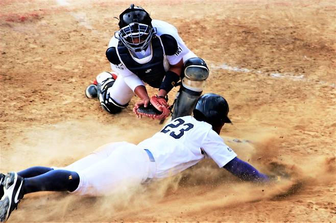 | ▲ 협회장기 고교야구전국대회 결승전에서 마산고등학교 안현민 선수가 홈으로 쇄도하고 있다. |