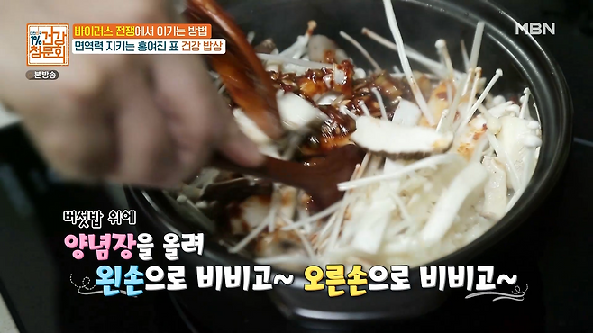 다 된 버섯밥에 만든 양념장을 올려