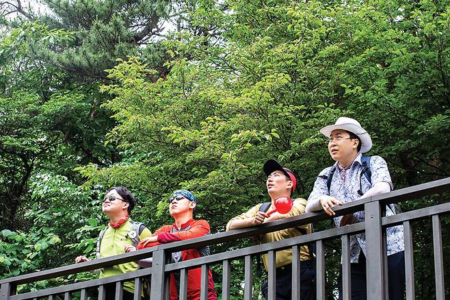 서울 종로구 삼청공원 말바위 전망대에서 각 캐릭터에 맞게 포즈를 취한 한사랑산악회 멤버. 왼쪽부터 정재형(정광용, 이하 극중 이름), 이용주(배용길), 김민수(김영남), 이창호(이택조).